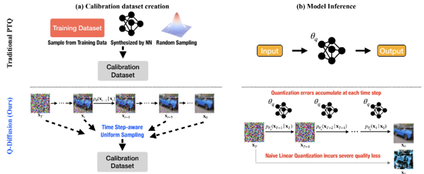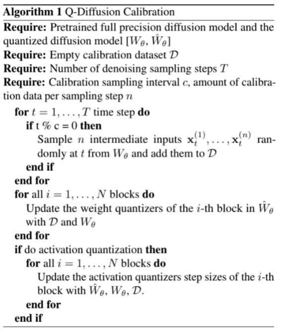 diffusion model quantization 에서는 training dataset 이 필요하지 않다. random input 을 사용하여 full precision model 을 샘플링 해서 생성할 수 있다. 따라서 diffusion model quantization 에서는 양자화 과정에서 훈련 데이터셋을 사용하지 않고도 보정 데이터를 생성할 수 있다