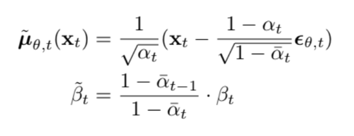time step 마다 noise 는 𝑥𝑡 로부터 noise estimation model( UNet 을 사용하고(최근에는 transformer 를 이용한 연구도 진행 중) time step 마다 weight 는 같음) 을 이용하여 구한다.