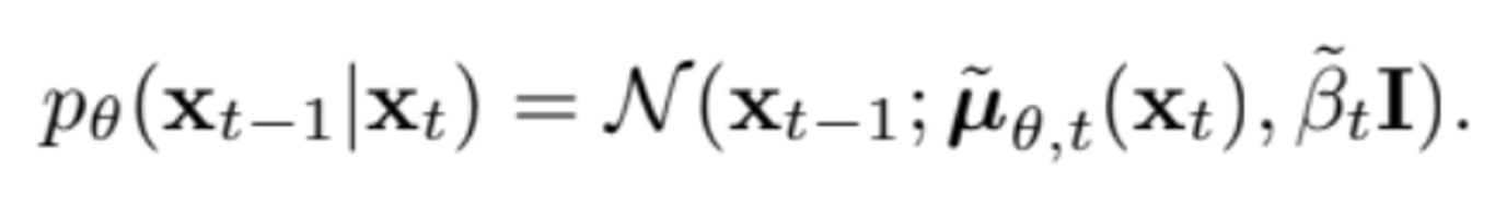 노이즈가 씌워진 sample( 𝑥𝑇~ 𝑁(0,𝐼) ) 에서 매 step 마다 noise 를 제거하면서 high-fidelity image를 얻는다. 하지만 실제 𝑞(𝑥𝑡−1∣𝑥𝑡) 의 조건부 확률은 구할 수 없기에 학습한 조건부 확률로부터 reverse 를 진행한다.