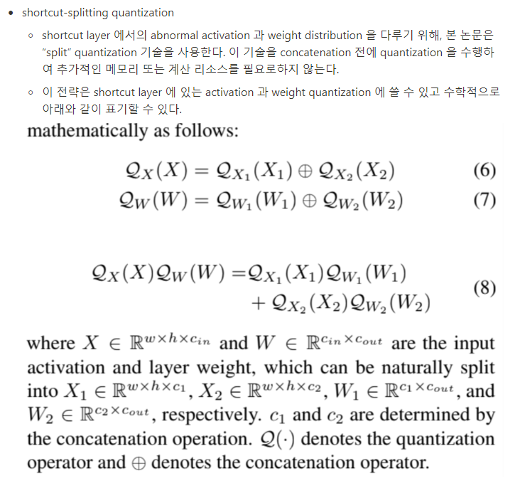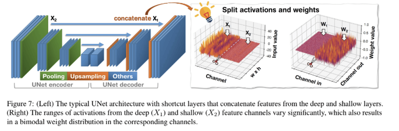 깊은 feature 채널(x1) 과 얕은 feature 채널(x2) 의 activation range가 함께 연결된다. 이는 곧 bimodal distribution 을 만든다. 동일한 quantization 을 사용하여 전체 weight 와 activation distribution 을 quantization 하는 것은 quantization error 를 만들 것이다.