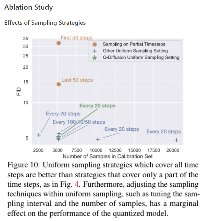 PTQ4DM 은 Normally Distributed time-step calibration 방법을 소개한다. 이 방법은 특정 분포를 갖는 모든 시간 단계에 대해 보정 데이터를 생성한다. 하지만 이 방법은 낮은 해상도, 8비트 정밀도, floating-point 어텐션 activation 간의 행렬 곱셈, 다른 calibration 방법에 대한 제한된 ablation study(어떤 구성 요소를 시스템에서 제거하여 해당 구성 요소의 중요성을 평가하는 방법) 한계가 존재한다.