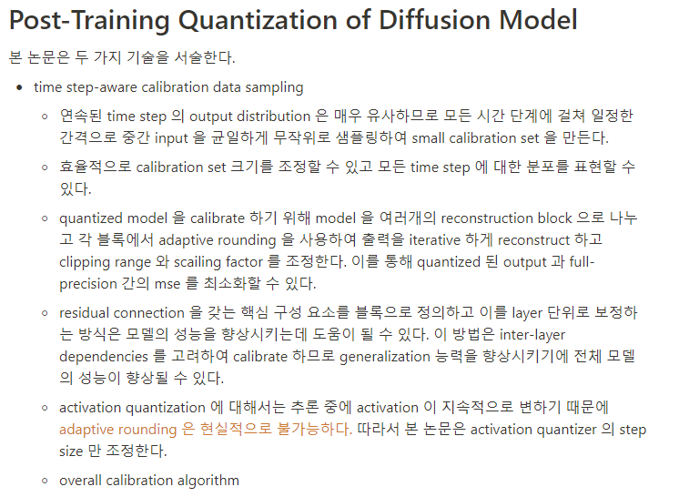이 논문은 모든 timestep 에서의 속도를 가속화하기 위해 noise estimation model 에 PTQ 를 적용한다. PTQ 는 go-to compression method 이고 training data 를 최소로 요구하고 하드웨어 장치에 직접 배포가 가증하기 때문에 현재 각광받는 연구이다.
